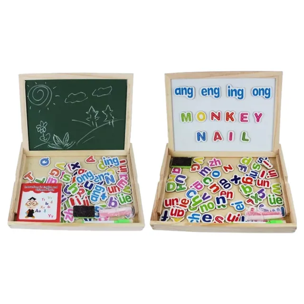 - المكونات: لوح خشبي مع مجموعة من الأحرف المغناطيسية